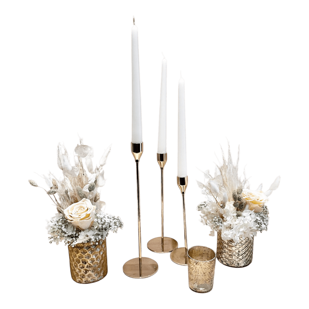 2x Goldgefäß ‚Orient‘ befüllt mit einem Trockenblumenstrauß in cremetönen